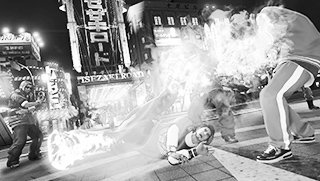 달밤이 비추는 빌딩의 벽면을 뛰어내려오며 무수한 단도를 쏘는 마지마. 지면에 꽂힌 단도가 피뢰침이 되어 번개를 모아 적을 불태운다.